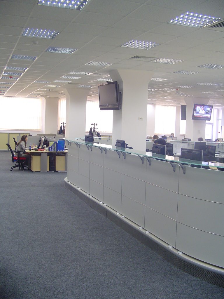 Over 1000 working stations: ergonomic desks with metal structure and vertical and horizontal cable management, desk division separation of each individual office, ergonomic task chairs with multiple adjustments for offices, special designed conference solutions, conference chairs, custom designed reception units raised on a special construction (15 cm above the floor height) as well as executive furniture were supplied during the period when we cooperated with the client.