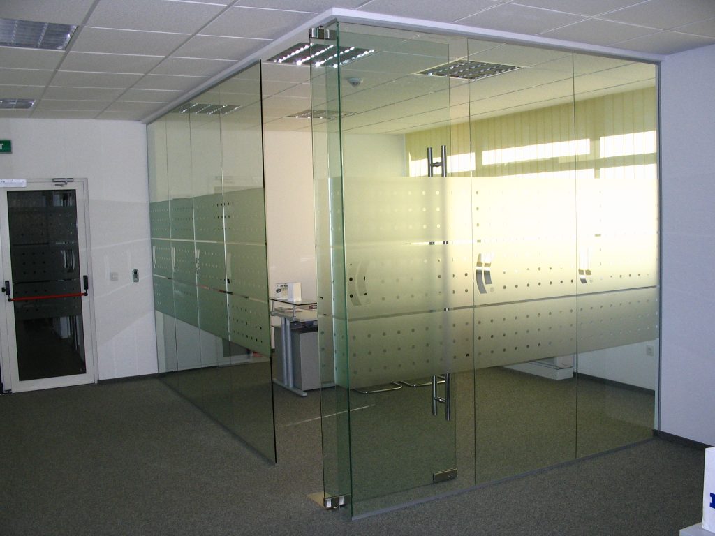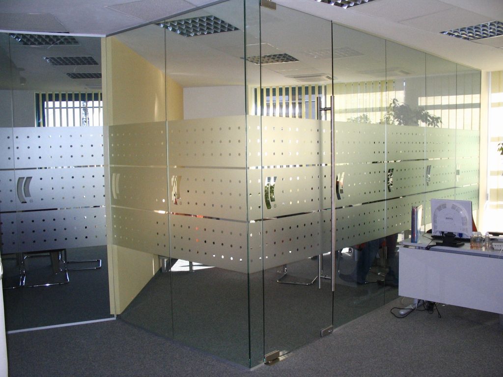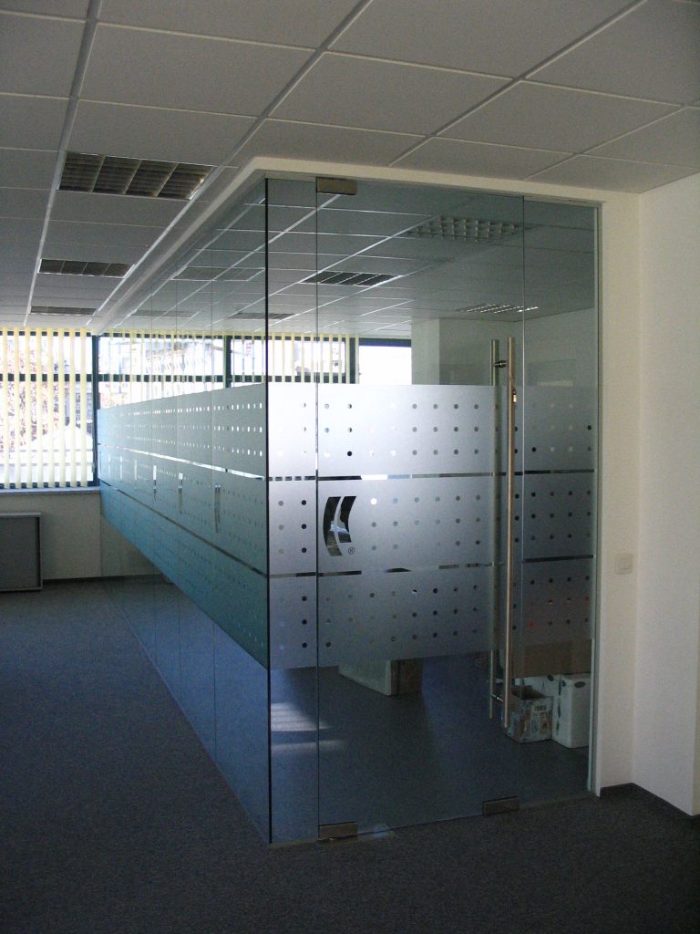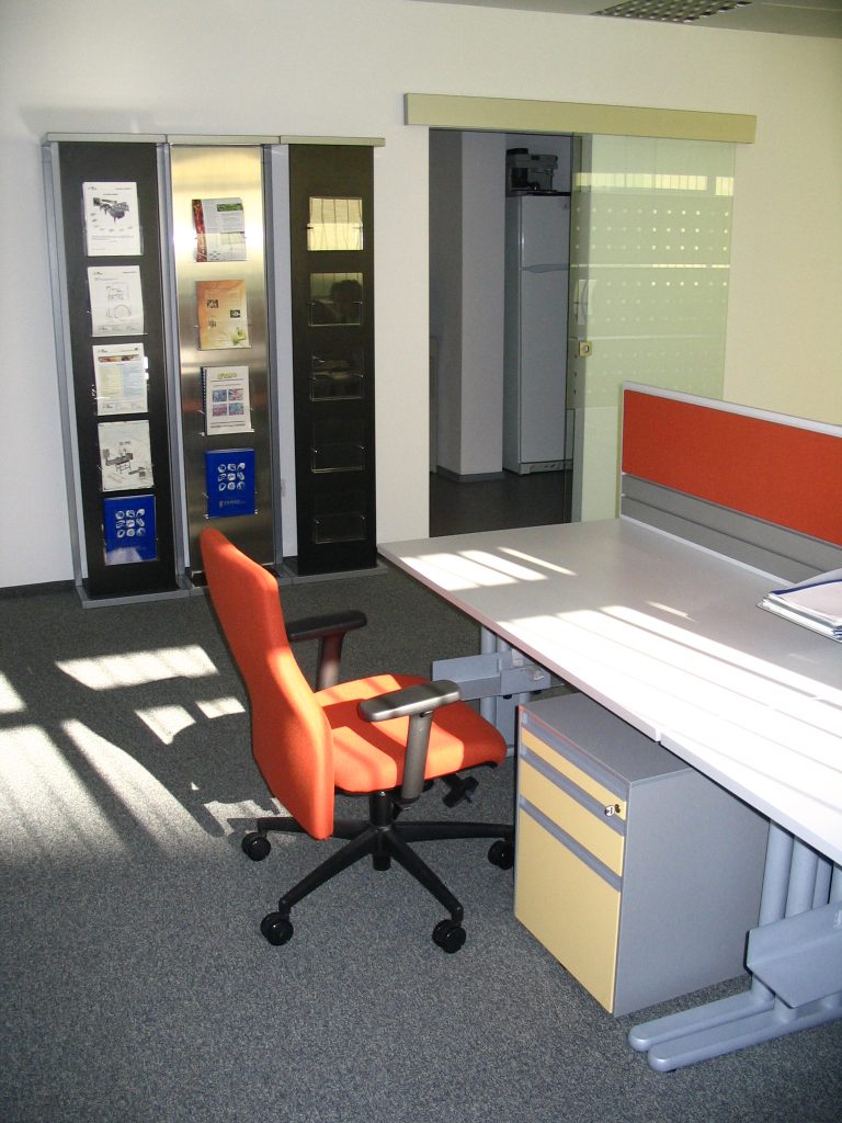 HaliSystem 130, with standard mobile pedestal with specific details, desk division fabrics upholstered in the same color as the chair and pedestal details, standard sliding door storage units and single glazed partitions with self returning Dorma elements braded accordingly for our client, made the project a successful reference.