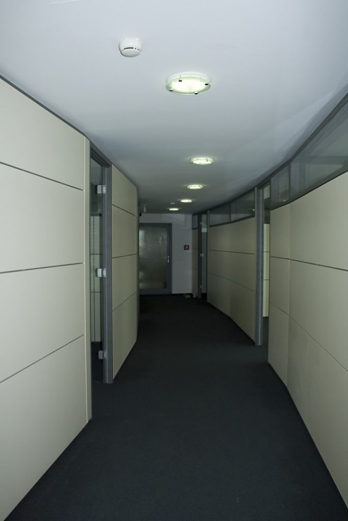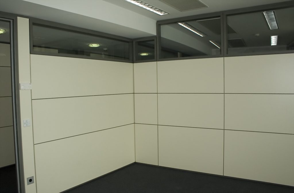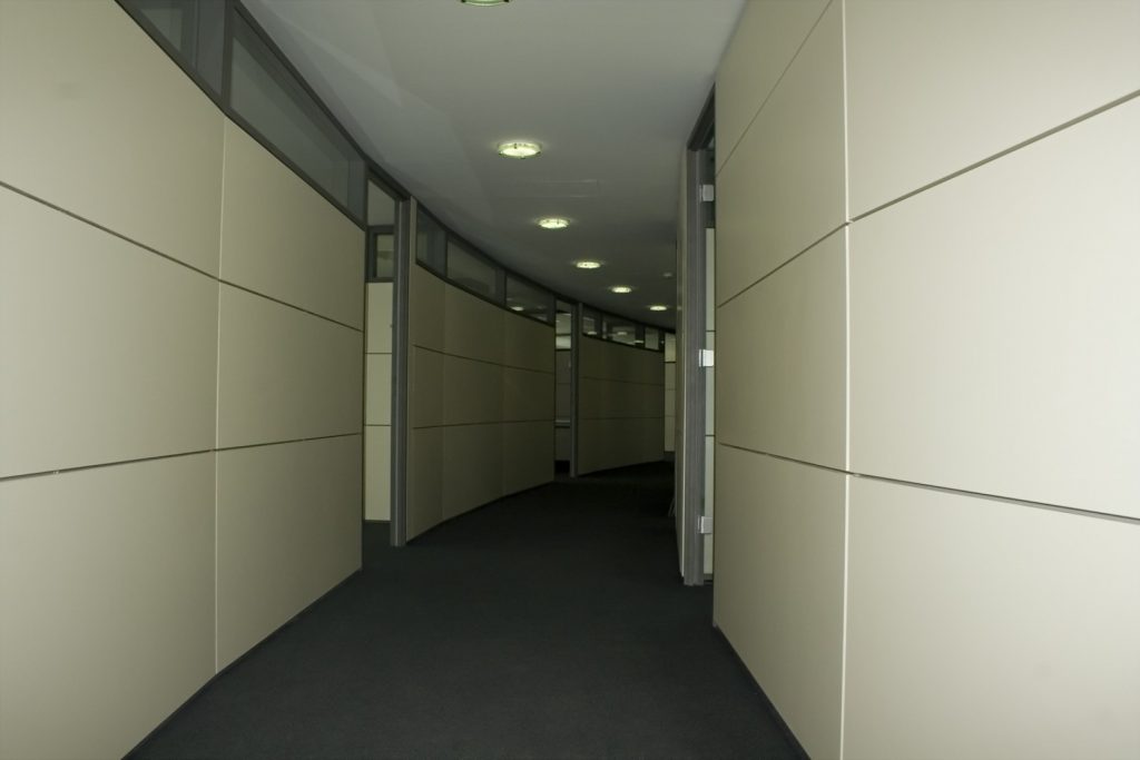 Pereții despărțitori modulari realizati din panouri pline, combinati cu partiții duble de sticla urmeaza, de asemenea, forma rotunda a clădirii. Dacă te uiți la detaliile și calitatea manoperei necesare pentru a efectua astfel de construcții, poti înțelege ca exista o cantitate enorma de muncă implicata.