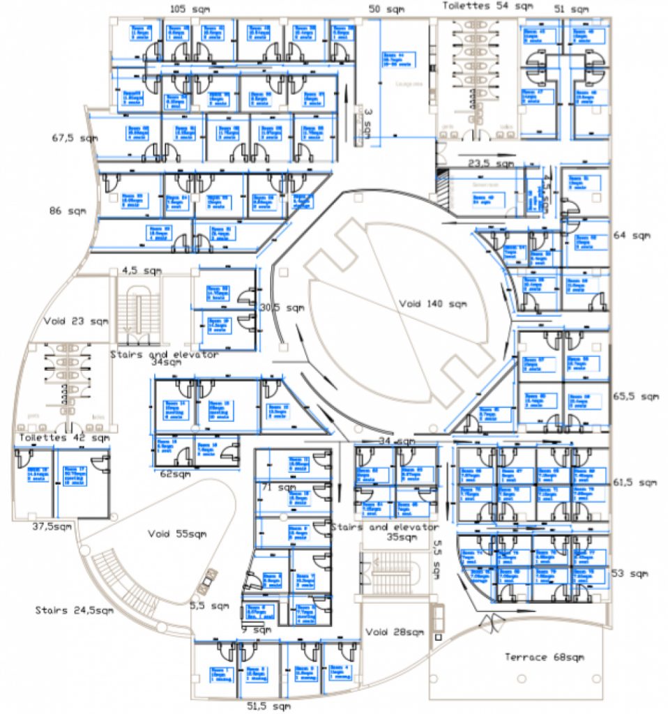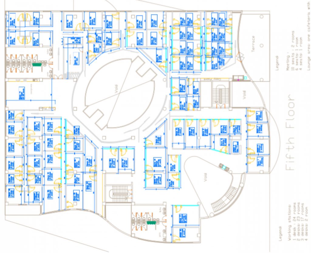 Based on the experience in handling such complex projects, we have created the framework of developping the business into the 4000 sqm (45000 sqf) floorplan located on top 2 floors into a newly built center in a bussy commercial street in Addis Ababa. The project involves the complete decoration of the open plan into fully equipped independent offices, as well as reception area, meeting and conference areas, storage facility, IT server rooms, etc.