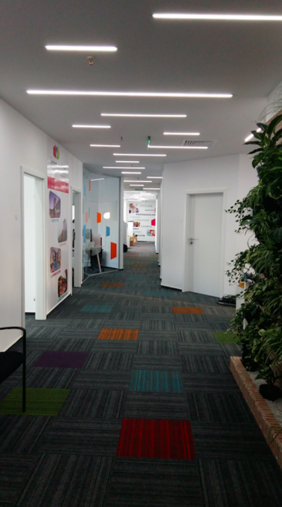 Proiectul a curins realizarea de tavane pline din gips carton si s-a bazat pe un concept inovativ si modern de amenajare a unui spatiu de birou: colorat in nunate corporatiste, imbinand zone de lucru cu spatii de relaxare speciale, sali de reuniune si intalniri dinamice, perete de separare mobil pentru a crea un spatiu dinamic al zonei de conferinte, elemente de proiectie, spatii si pereti verzi, kichineta speciala cu perete „sportiv”, zona de relaxare si intarire a spiritului de echipa: „team.ro”